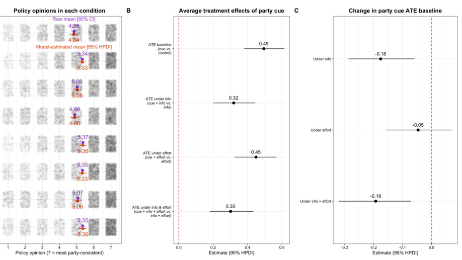 Party cues can influence public opinion, but the extent to which they do so varies dramatically from context to context. Why? The long-standing theory that party cues function as “heuristics” provides an answer, predicting that variation in exposure to policy information, a propensity for effortful thinking, or both causally affects the influence of party cues. However, this prediction has escaped decisive empirical testing to date, leaving in its wake a string of mixed results. Here we characterize the challenges that limit previous tests, and report on two large-scale experiments designed to overcome them. We find that exposure to policy information causally attenuates the influence of party cues, but engagement in effortful thinking per se does not. Our results advance understanding of the “when” and “why” of party cue influence; clarify a number of previously ambiguous findings; and have broad theoretical, methodological, and normative implications for understanding the influence of party cues.